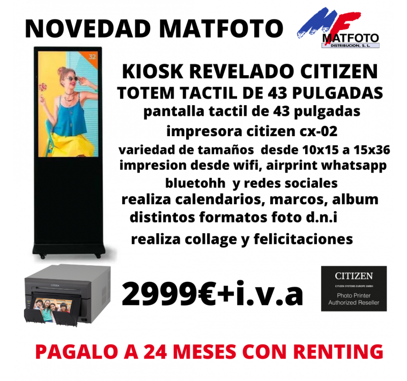 Descubra el Kiosco de Fotos Digital TT43C 43 Pulgadas de Sotelec, un totem vanguardista diseñado para transformar cualquier espacio comercial en un potente centro de impresión fotográfica profesional. El TT43C combina una tecnología de visualización avanzada con el software iKiosk personalizado por Sotelec y la calidad insuperable de las impresoras Citizen, garantizando una calidad de impresión profesional a un precio imbatible.