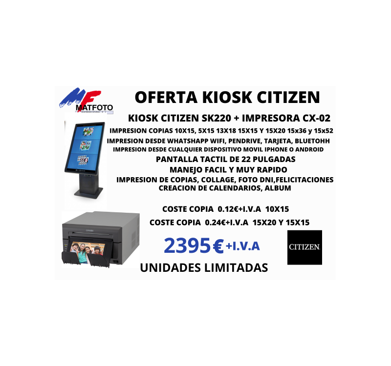 El Global Kiosk Pack + Impresora CITIZEN CX-02 es la solución profesional todo en uno que tu negocio fotográfico estaba esperando. Diseñado y fabricado por nosotros, este sistema combina un kiosko robusto y elegante con una impresora CITIZEN CX-02, formando un conjunto perfecto para impresión fotográfica instantánea en tiendas, centros comerciales, estudios y eventos.